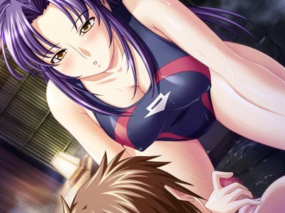 - 競泳水着を着た姫乃一美が露天風呂で主人公のちんこを手コキし射精させる