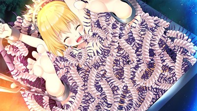 - 両手足に巻き付いた触手に大の字で拘束されたルシフェルがアナルから挿入された触手を口まで貫通され目をむいて悶える