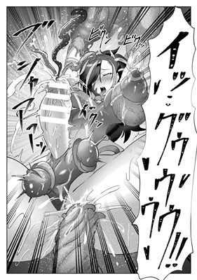 - 触手の化け物に仰向けで磔にされるようにして拘束されたサキがチンコに触手を挿し込まれて大量の卵を産み付けられる