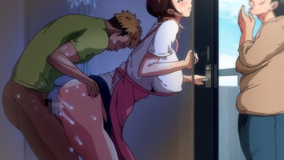 - 玄関を少しだけ開けて近所のおばさんと会話する裕美子が主人公にクンニされ必死に平然を装う
