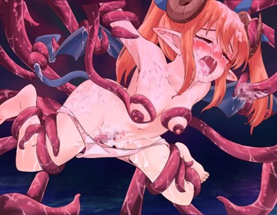 - パンツと乳房を丸出しにして触手に拘束されたアルムリアが膣を触手で穿り回され絶頂する