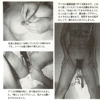 - ラビアにクリップを挟まれた的場梨香が重りをつるしたまま立たされる