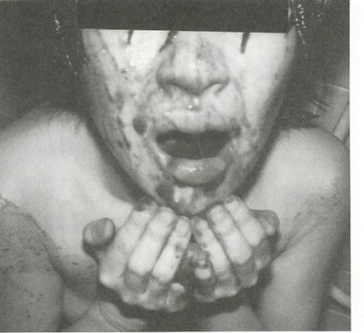 - 仰向けに寝転がる隷可が全身に糞を塗りたくられる
